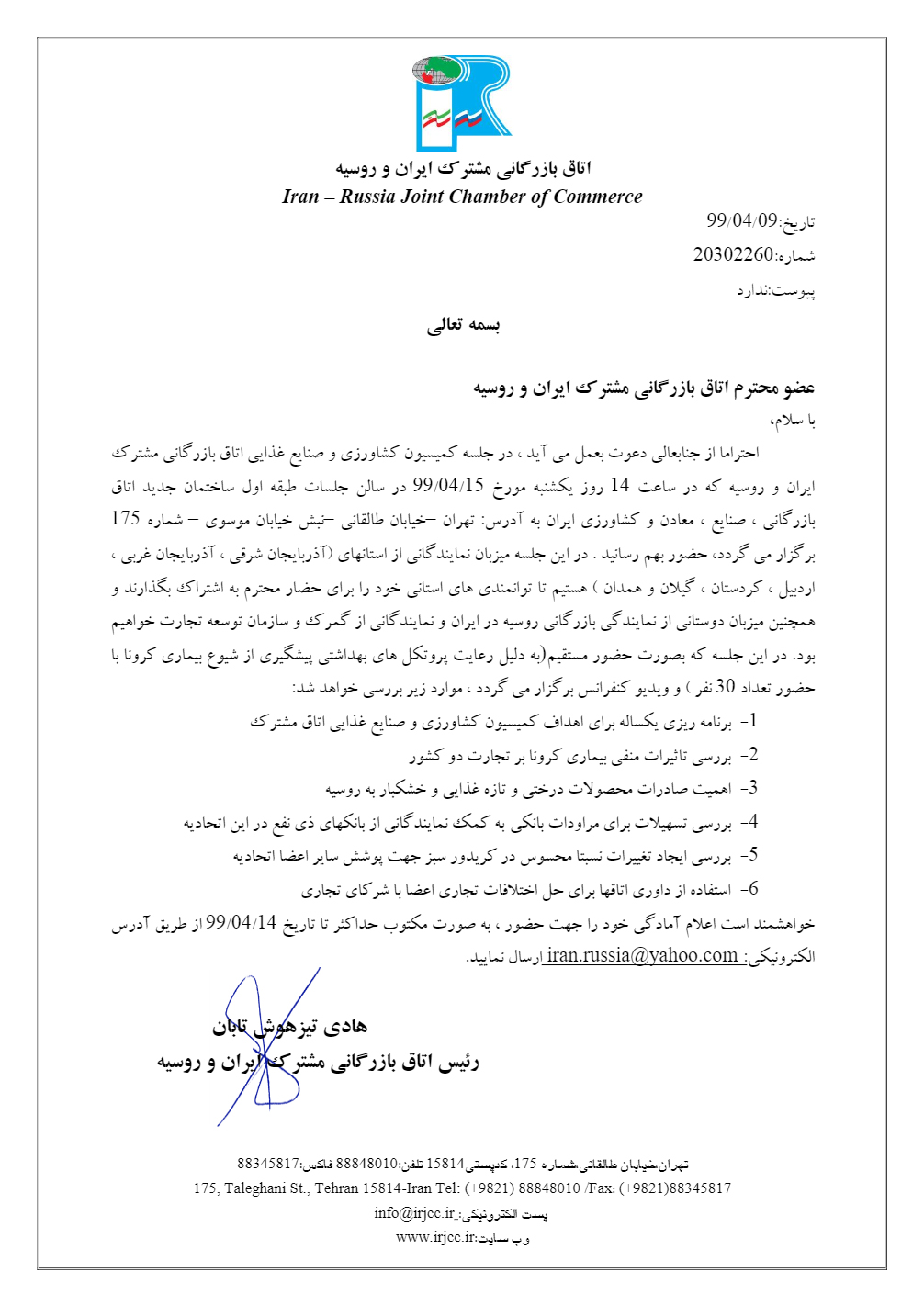 دعوتنامه جلسه کمیسیون کشاورزی و صنایع غذایی ۱۵ تیر۹۹
